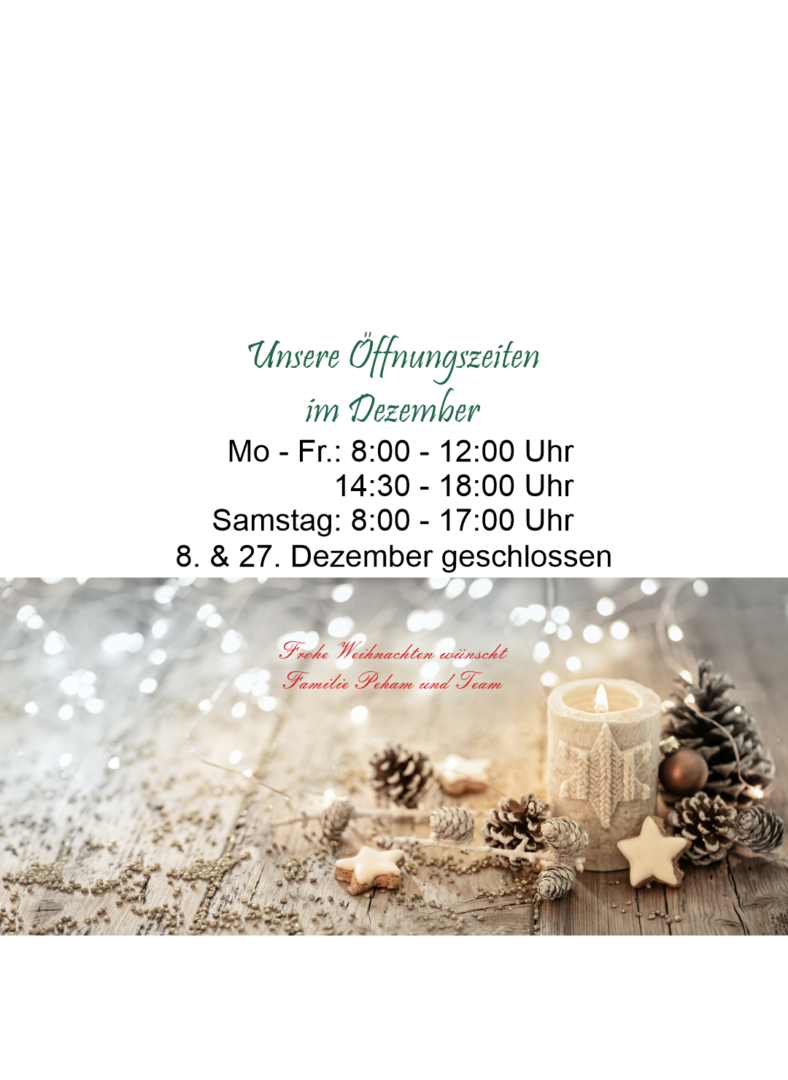 Liebe Kunden, wir haben in der Adventzeit geänderte Öffnungszeiten. Montag - Freitag 8:00 - 12:00 und 14:30 - 18:00 Samstag 8:00 - 12:00 und 14:00 - 17:00 Frohe Weihnachtszeit, wünschen Ihnen Familie Peham und Team.