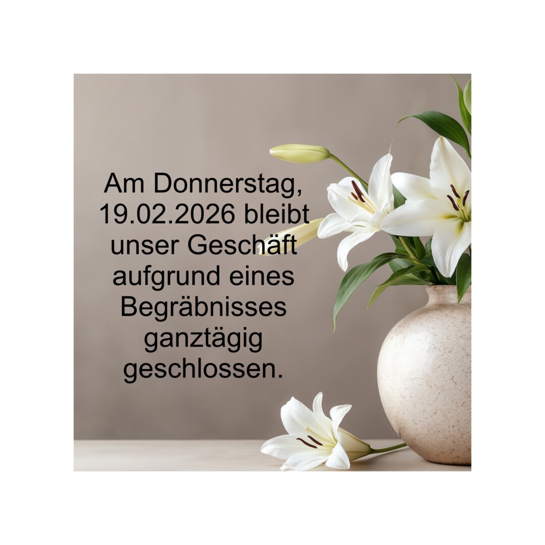 Sehr geehrte Kunden, aufgrund familiären Feierlichkeiten haben wir am Samstag den 8.2.2025 geschlossen. Wir bitten um Verständnis. Ab Montag dem 10.2.2025 sind wir wieder gewohnt für Sie da.